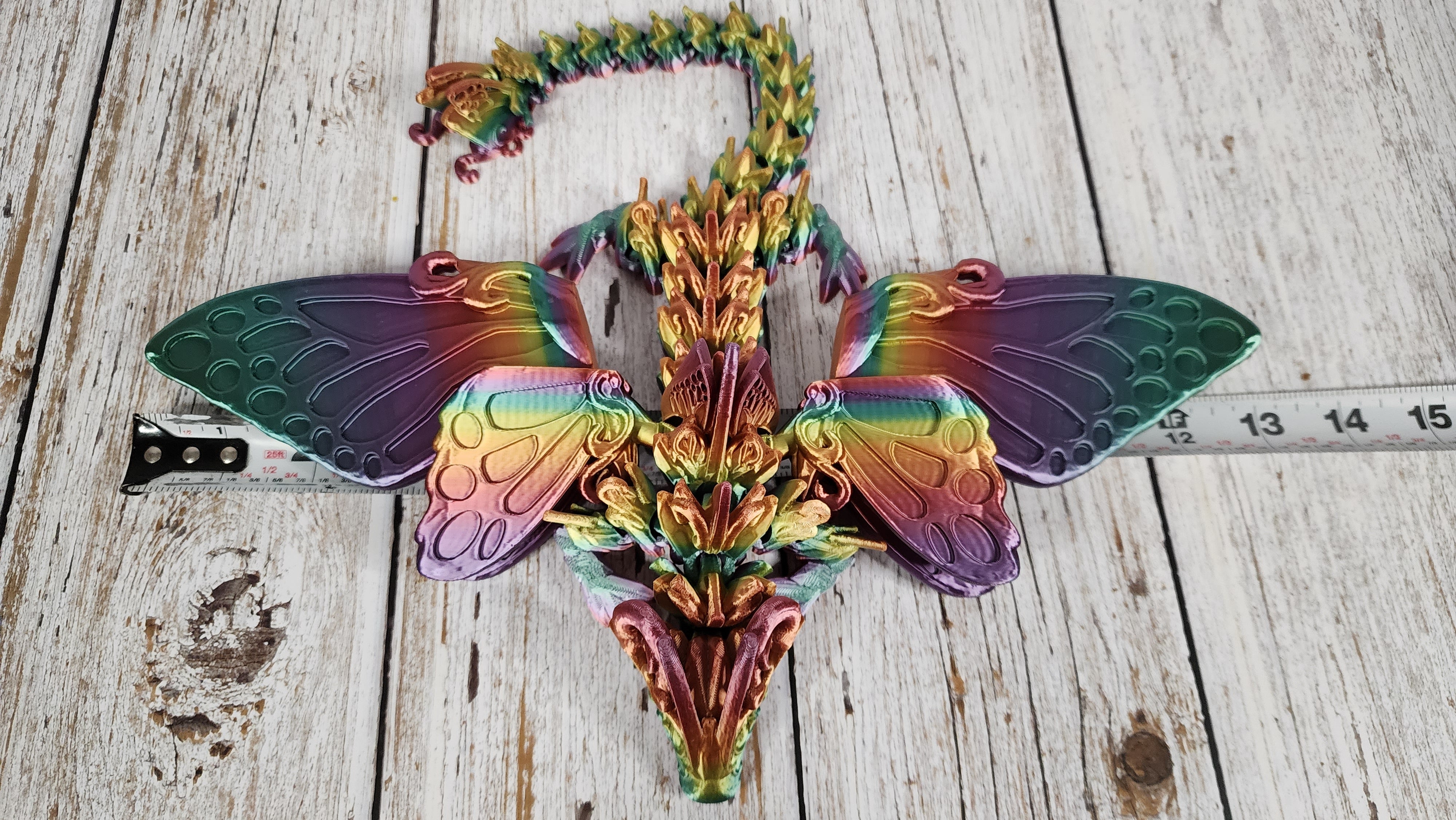 Pictured is a 15" silk rainbow. It has a stunning wing span of 13"!