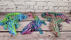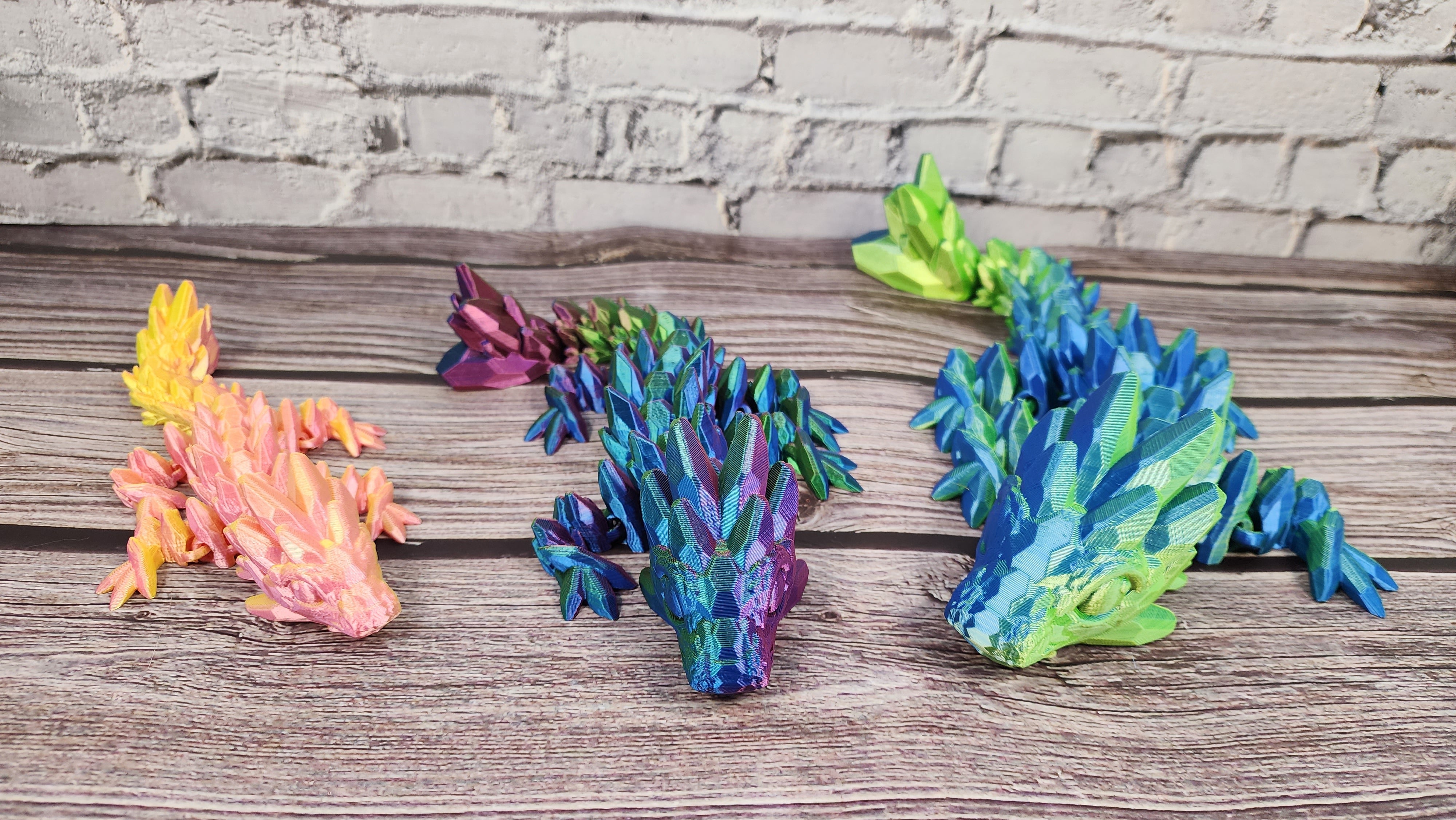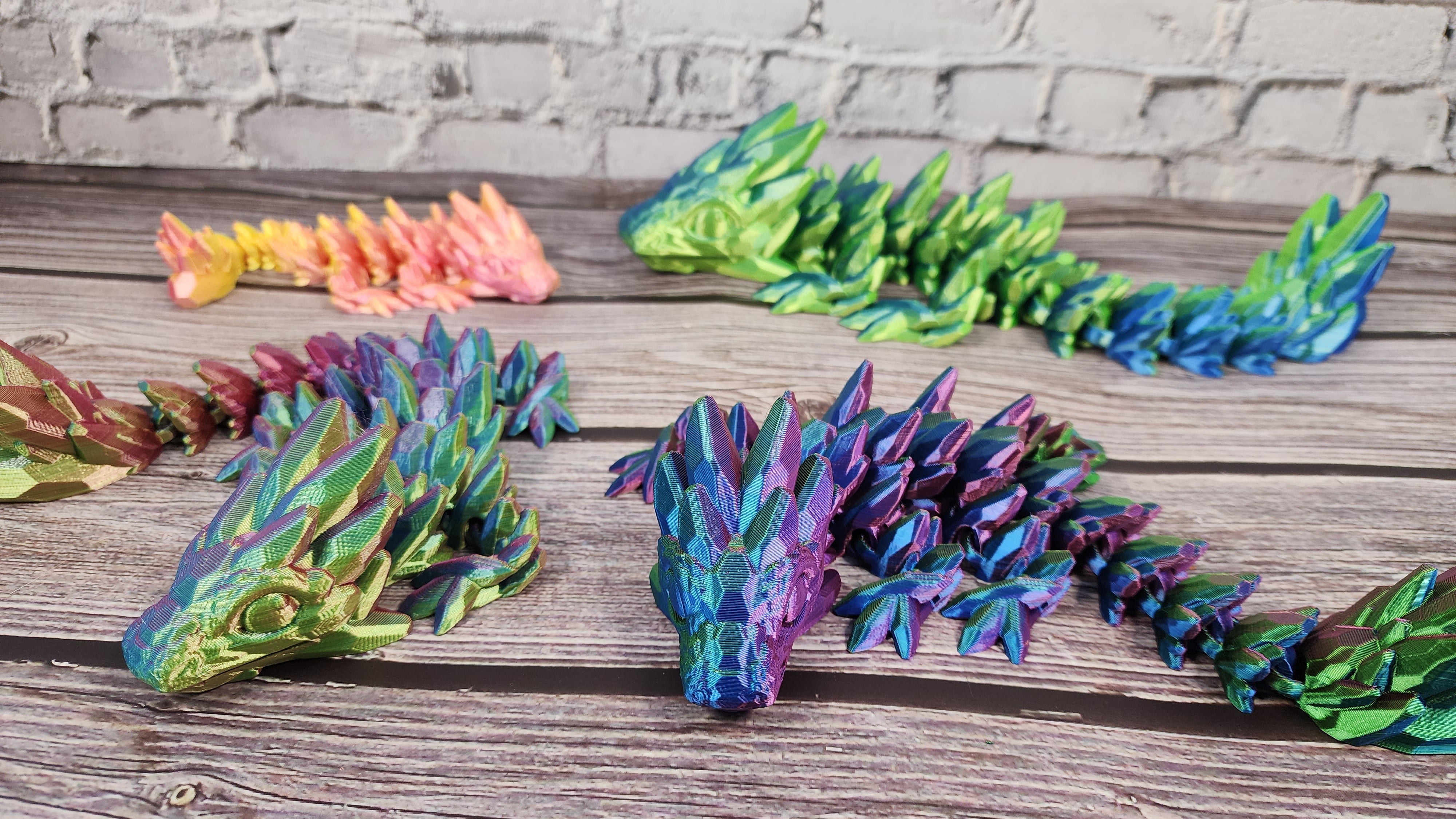 So many colors to choose from for this beautiful and hyper flexible gemstone dragon. This is a twist on the existing crystal dragon, but with smooth edges and joints that are more flexible. Looks absolutely fantastic in any color, but even more so in our shiniest colors. Our color select is unmatched, adding new colors frequently.
