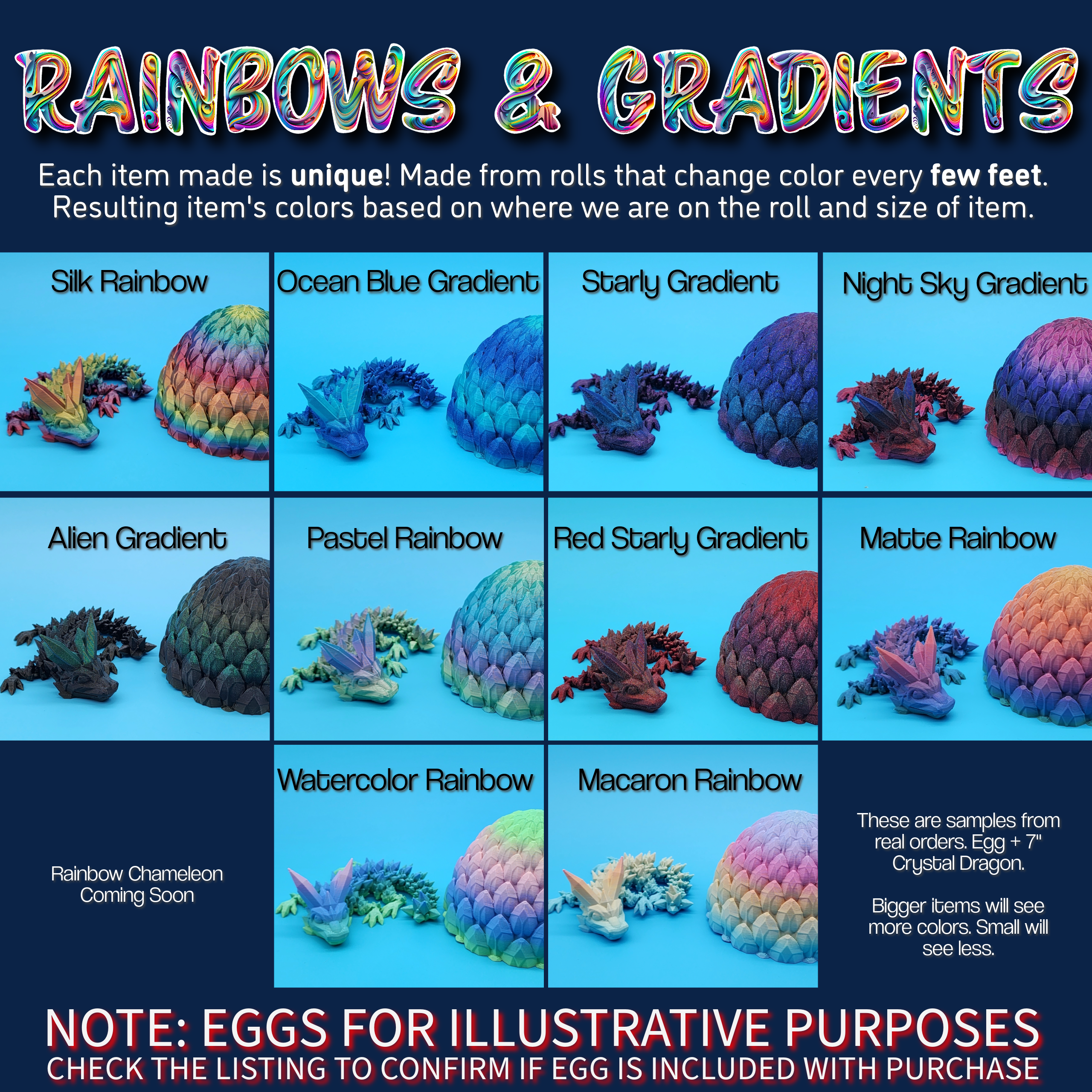 Crafted with passion using top-of-the-line 3D printers, our dragons boast unparalleled quality. With a vast palette, we showcase popular and unique colors! Dive into Magic, TriMagic, Rainbow, and Gradient hues, each bearing unique finishes that make these dragons stand out.