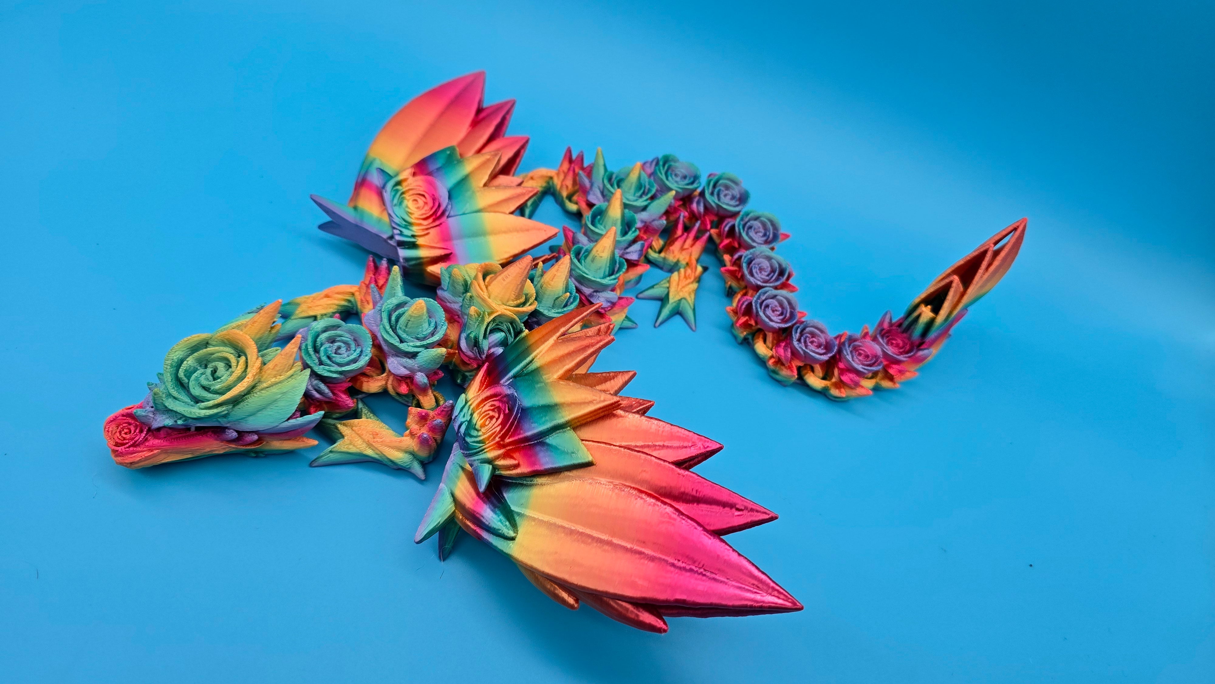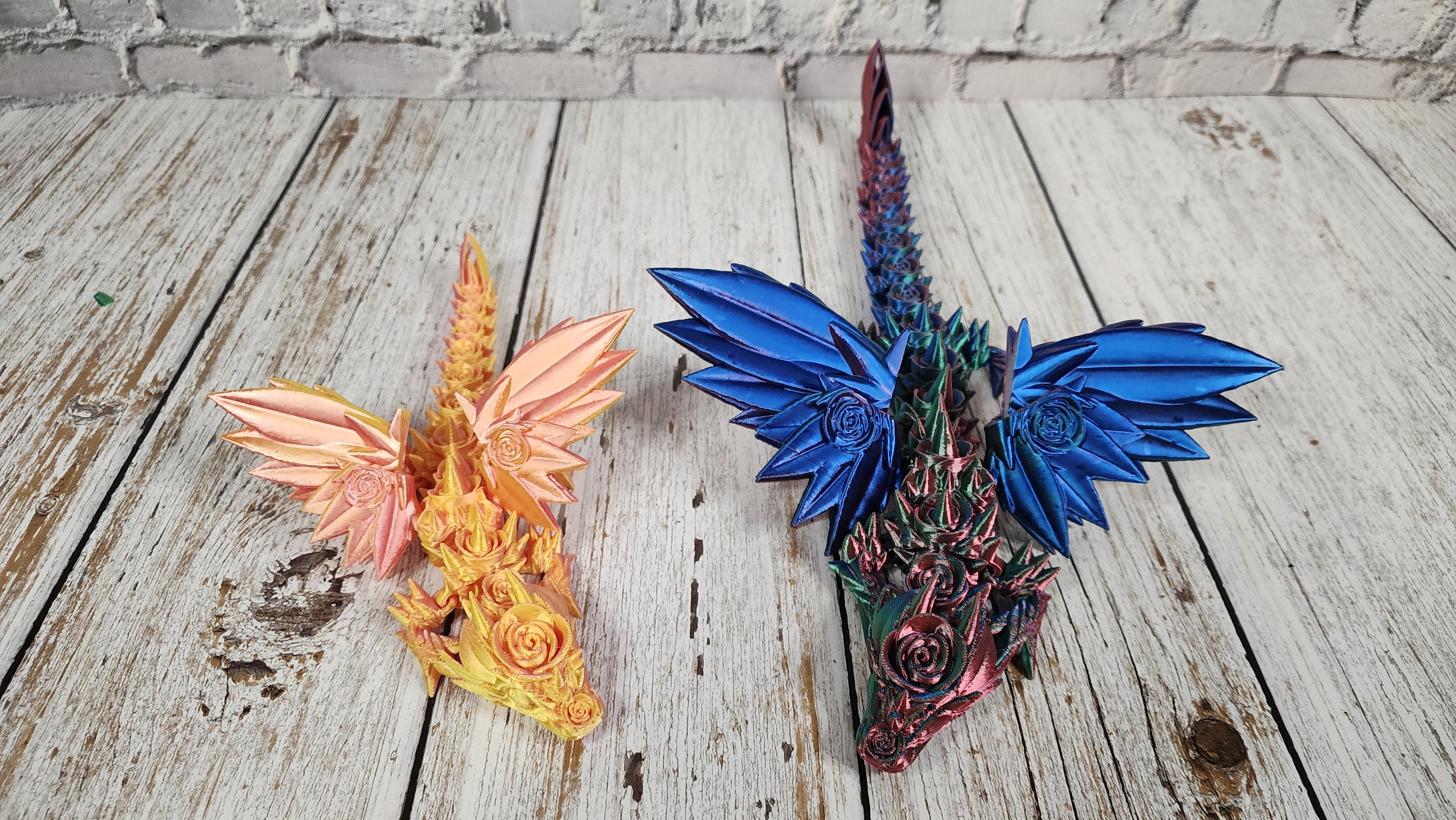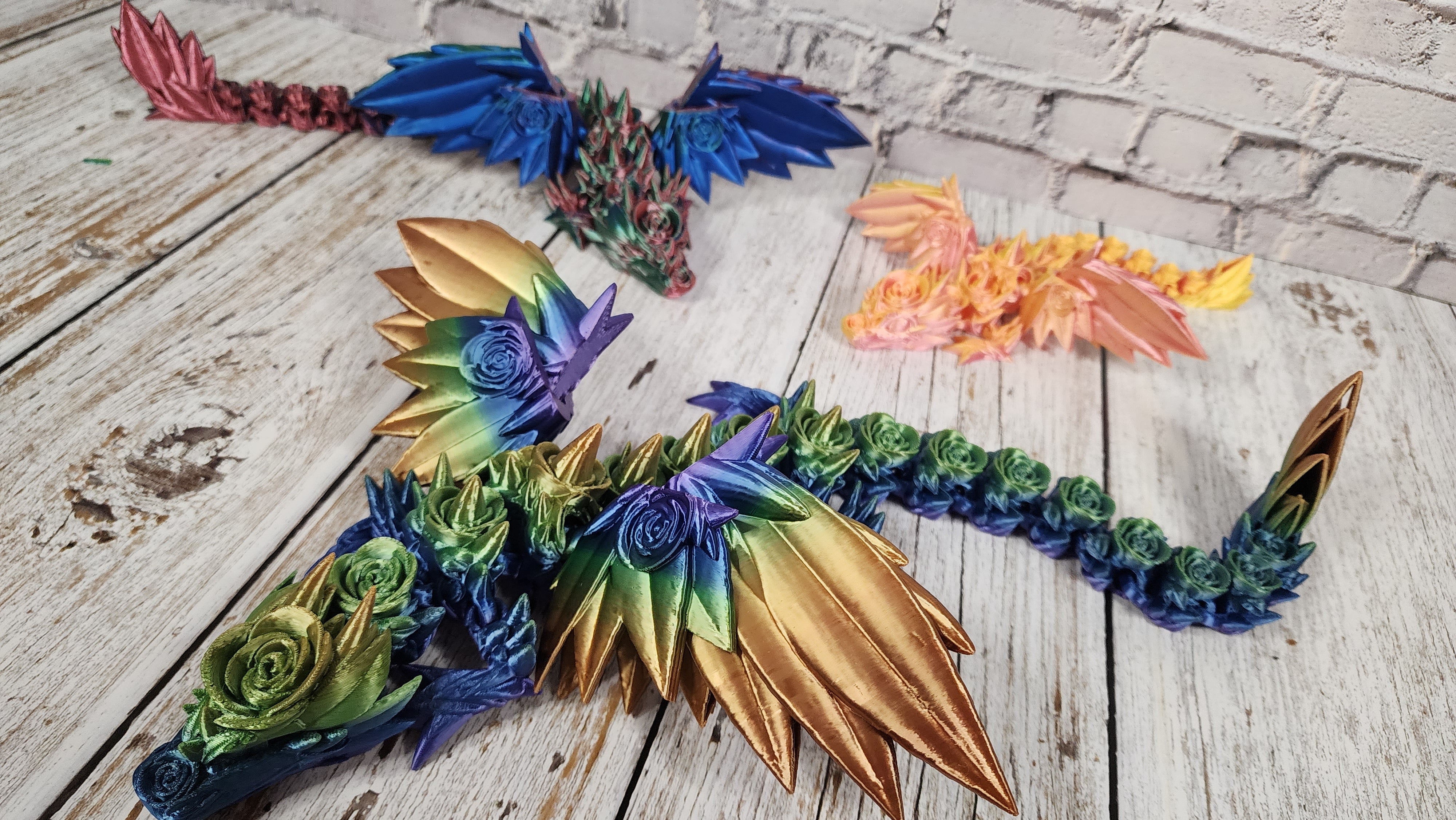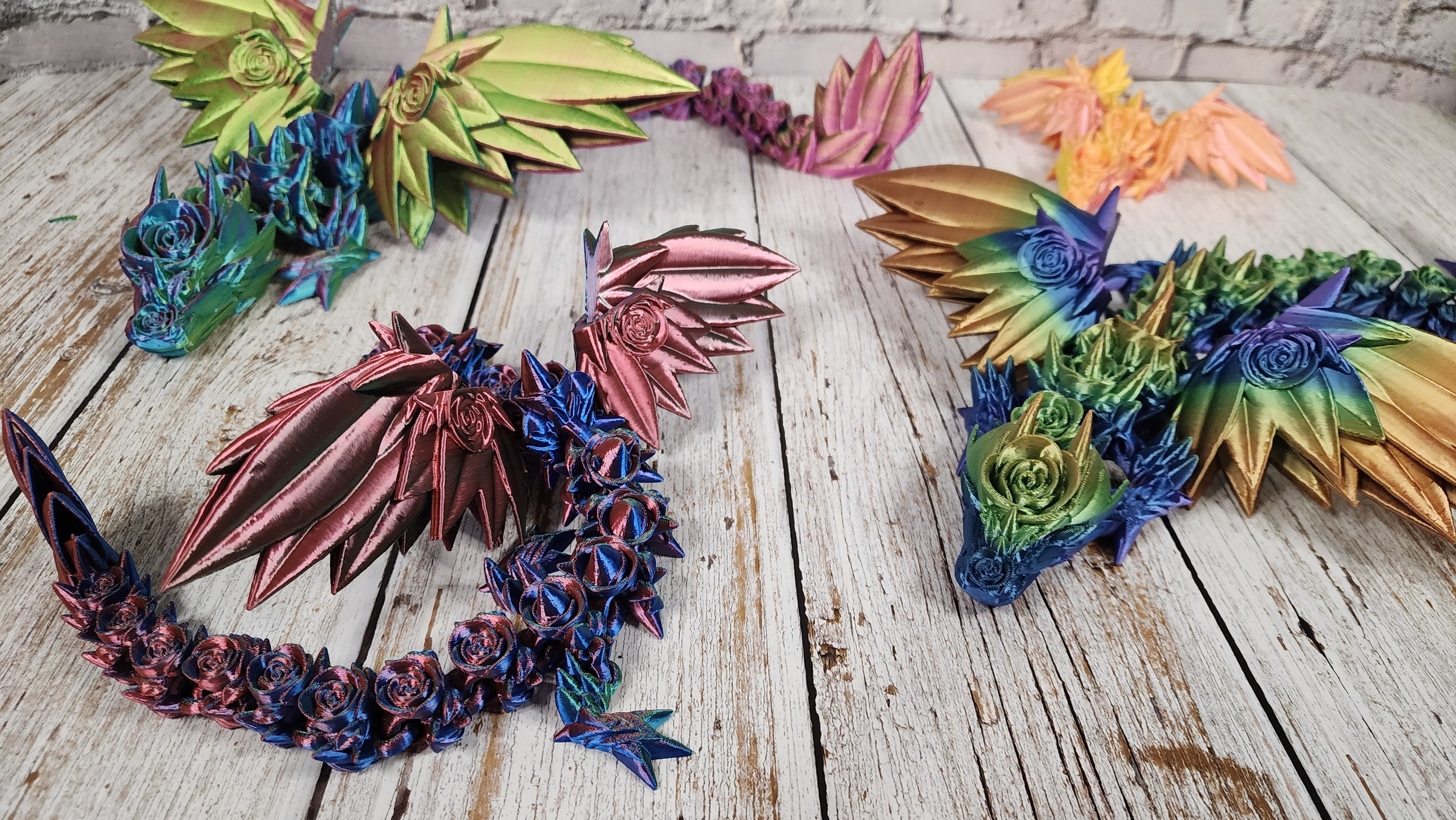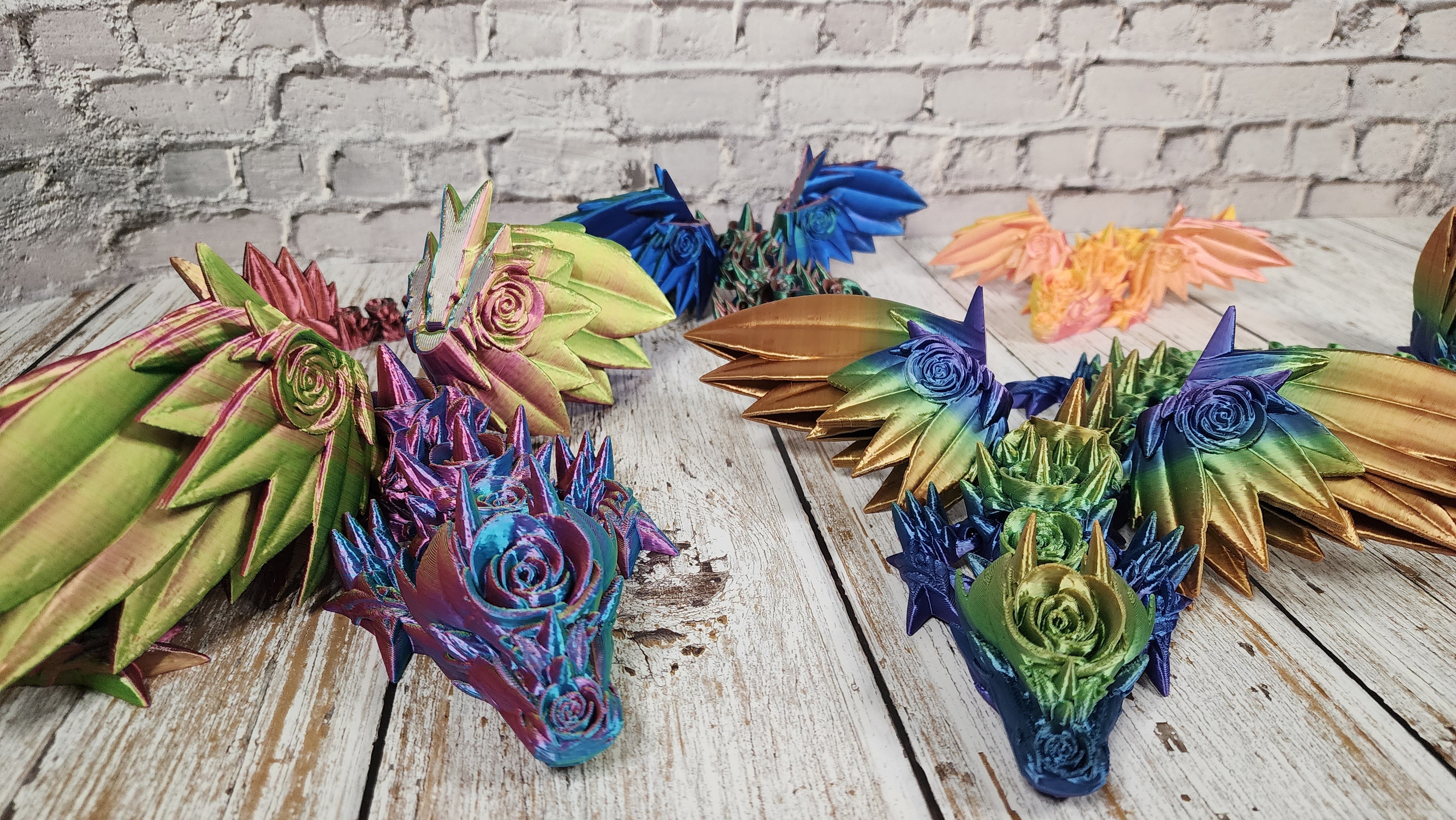 So many colors to choose from for this beautiful and adorably flexible rose wing dragon. The angular and rose petals are fantastic for showing off its colors, even more so in our shiniest and magic colors. Our color select is unmatched, adding new colors frequently.