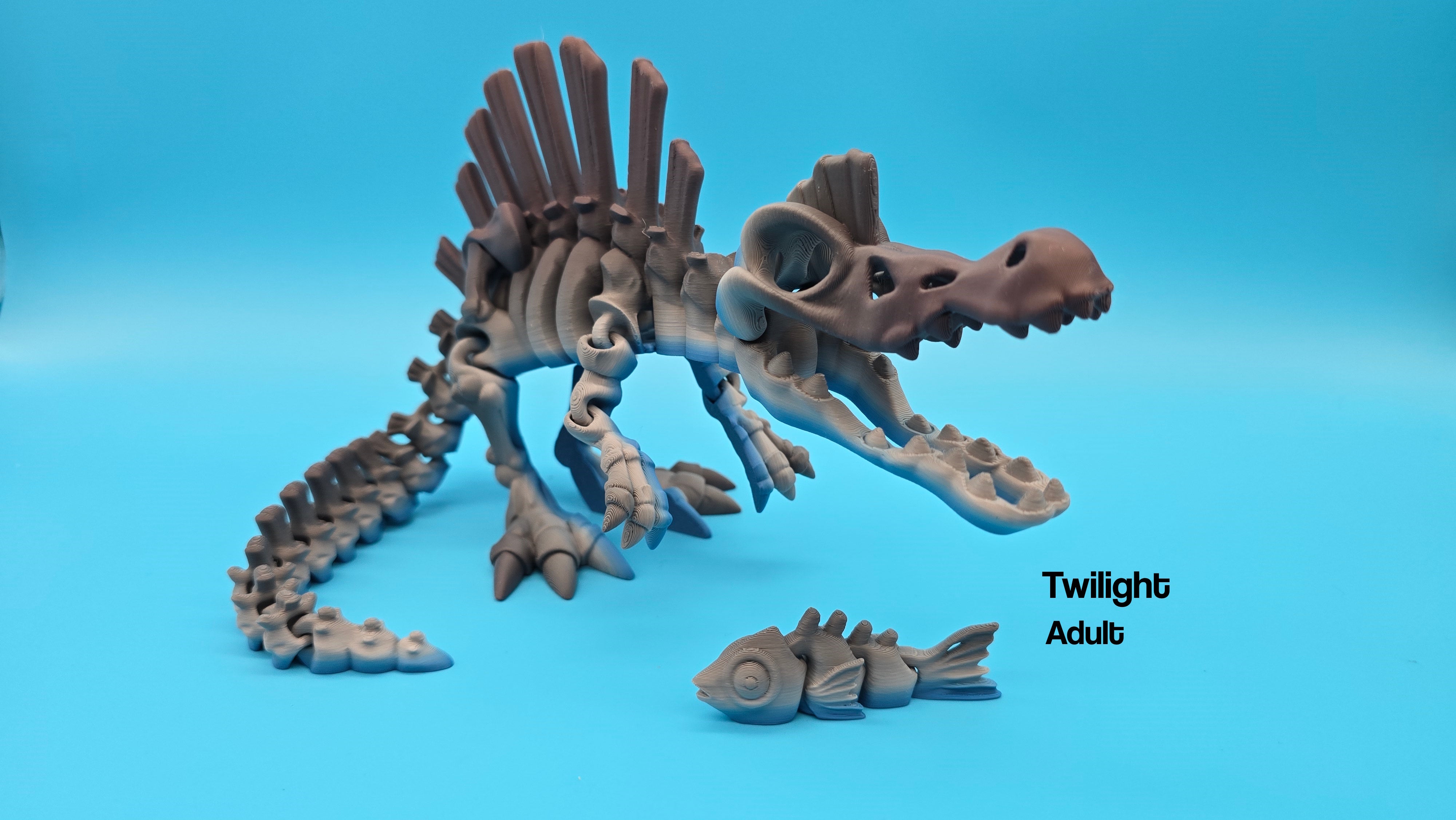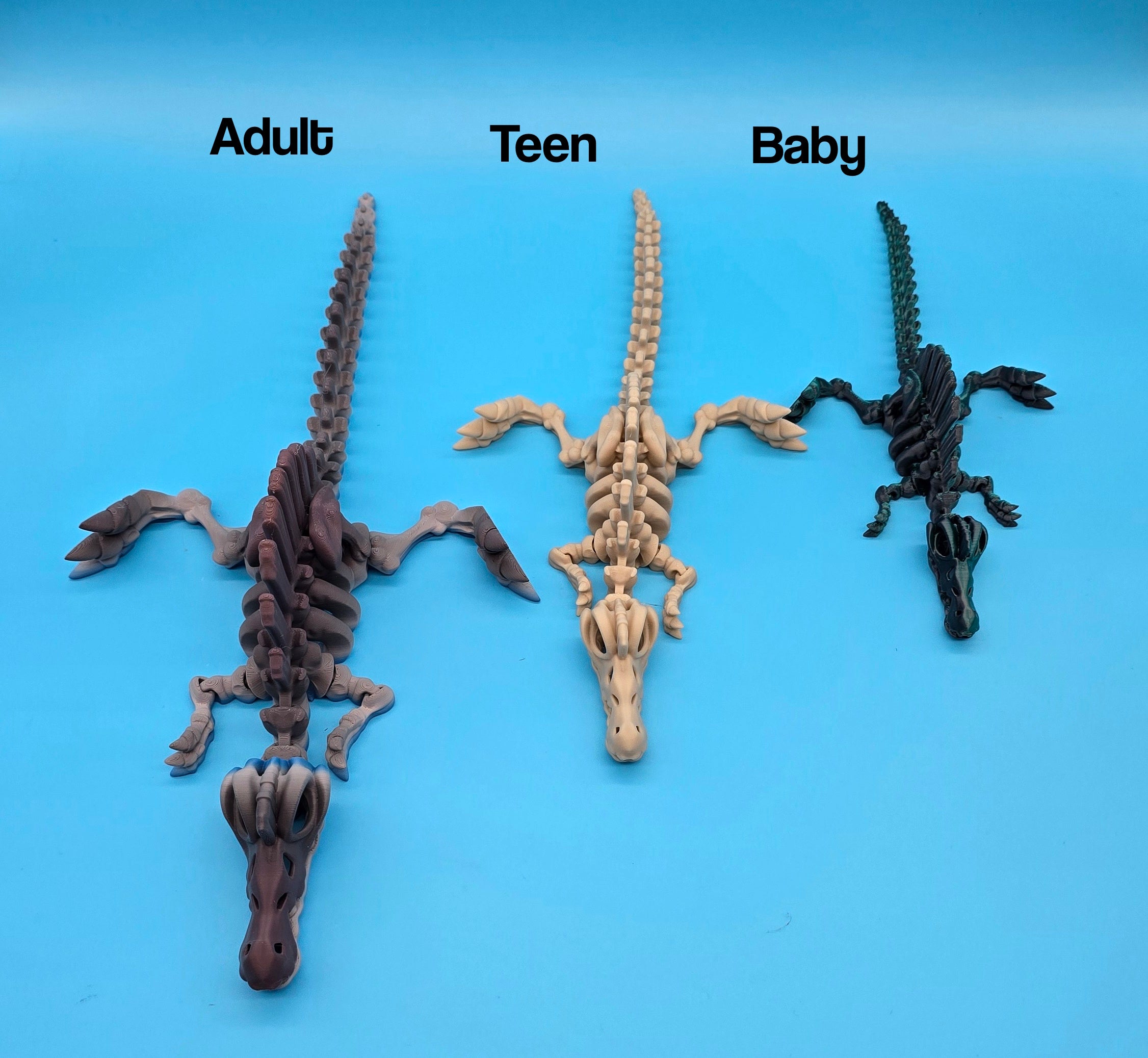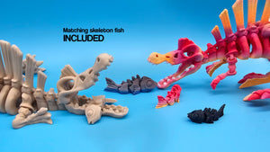 Includes a skeleton fish! Are you ready to dive into the world of dinosaurs? This jaw-some product comes in not one, but two styles, and four different sizes. One style features white teeth, while the other comes in a single color. But wait, there's more! This Spinosaurus can also open and close its jaws, giving you the ultimate interactive experience.